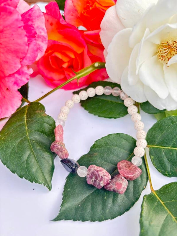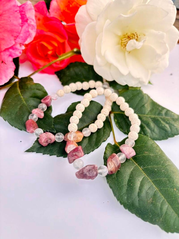 Dieses handgemachte Armband vereint die zarte Energie des Rosenquarz mit der tiefen Kraft von rotem Turmalin und der ruhenden Klarheit des weißen Lavasteins. Es unterstützt dich dabei, liebevoll bei dir selbst anzukommen – mit offenem Herzen und gut verwurzelt.